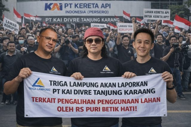 Kabarlambar.com -Aliansi Triga Lampung menyatakan akan melaporkan pihak PT Kereta Api Indonesia (Persero) Divisi Regional IV Tanjungkarang ke kantor pusat PT KAI di Bandung serta Kementerian Perhubungan Republik Indonesia. Langkah ini diambil terkait dugaan penyalahgunaan lahan aset perkeretaapian oleh RS Puri Betik Hati di wilayah kecamatan Way Halim, Bandar Lampung.